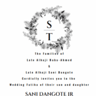 Will You Attend Please RSVP ! We would like to formally invite you to the Wedding Fatiha of Sani Dangote Jnr and Tasnim Baba-Ahmed. Friday, December 12th, 2025 | 1PMSultan Sa’ad Mosque, Baze University, Plot 686 Cadastral Zone , COO, Abuja Please enable JavaScript in your browser to complete this form.Name *FirstLastEmail *Will you attend our Wedding Fatiha ?YesWill not be available Name attend ? Comments Send When & WhereWe love to see you soon The Wedding Fatiha Friday, 12th December, 2025 01.00 PM Sultan Sa'ad Mosque Baze University, Plot 686 Cadastral Zone, COO, Abuja